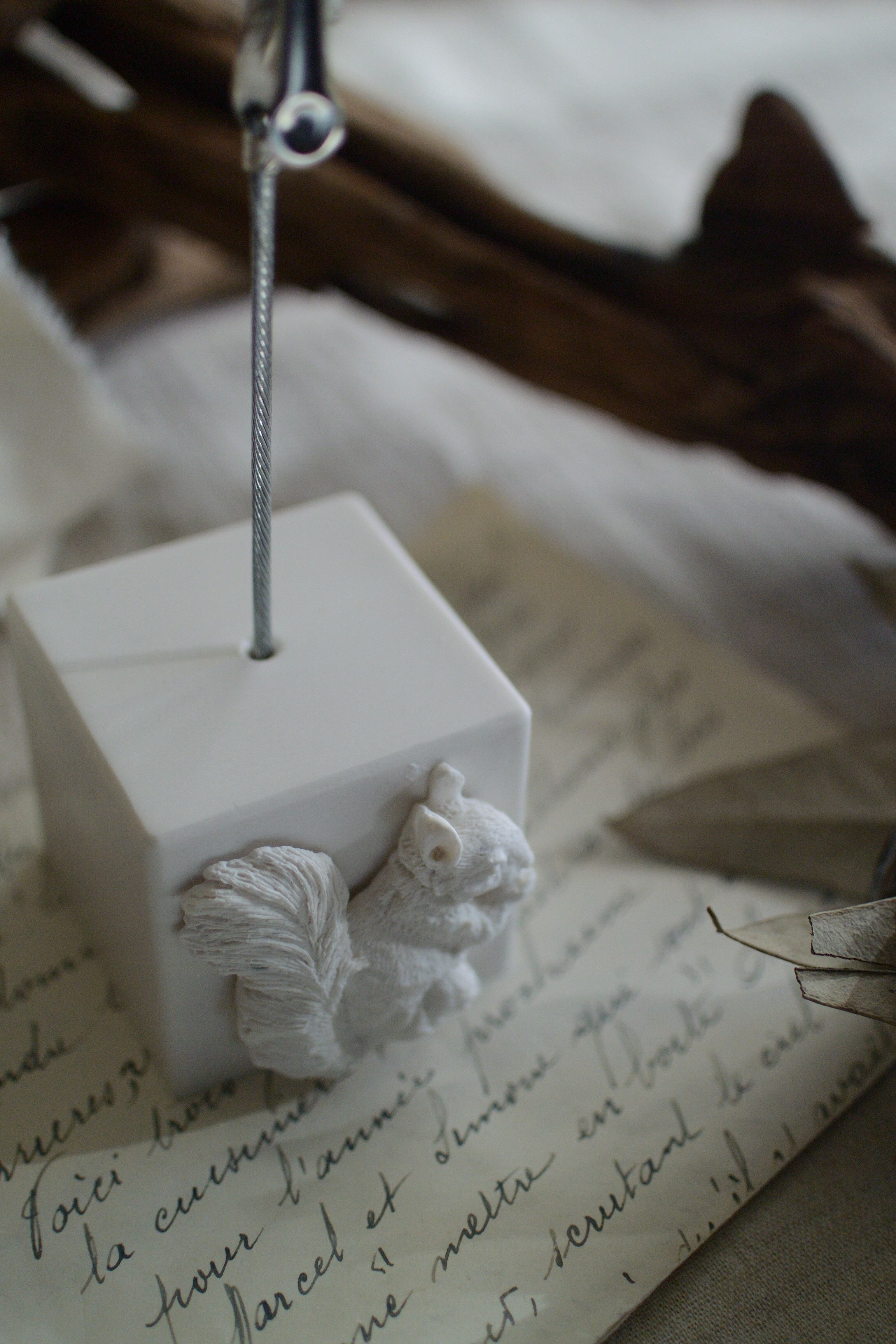 キューブ型の土台にリスのデザインが入ったクリップスタンドです。